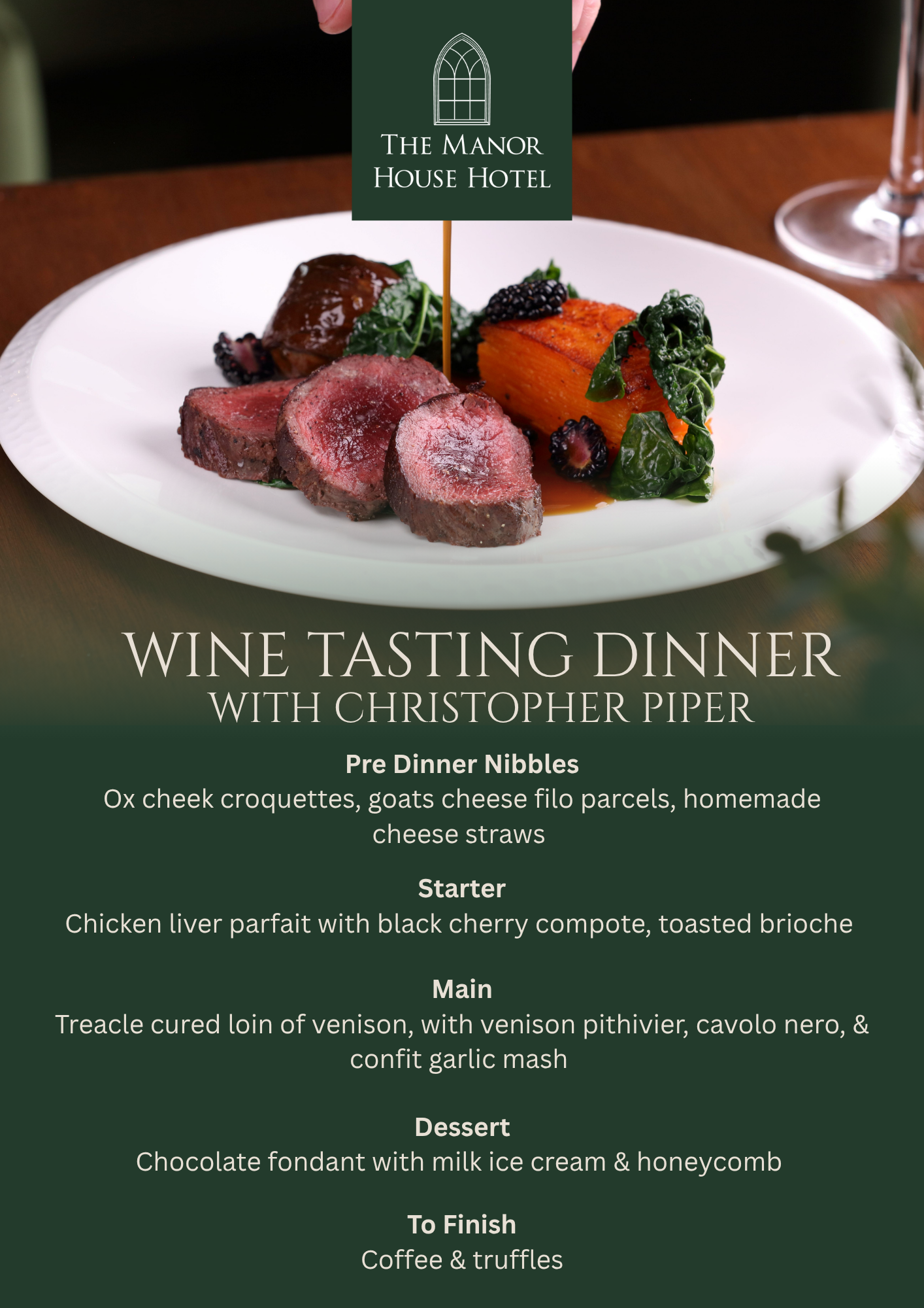 Join us for an elegant evening of fine food and exceptional wines at The Manor House Hotel, as we host a Wine Tasting Dinner in collaboration with Christopher Piper Wines.